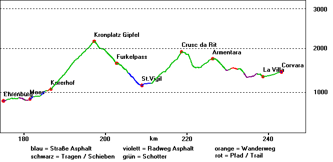 | Höhenmeter bergab: | 2209 Hm | Schotter: | 50,55 km | 74,0 | Streckenanteil eben: | 5,41 km | ||||||