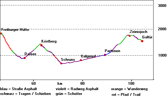 | Höhenmeter bergab: | 2034 Hm | Schotter: | 13,3 km | 23,2 | Streckenanteil eben: | 5,94 km | ||||||