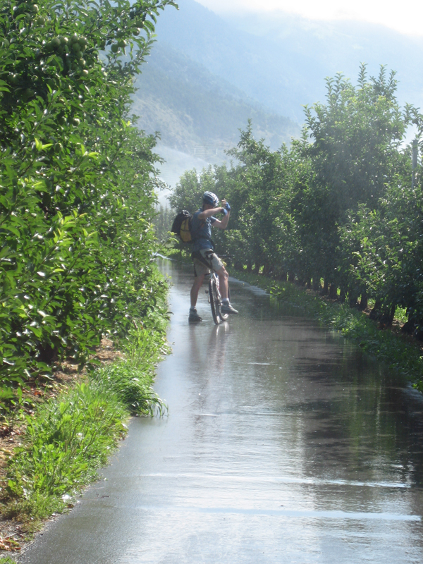 Von Prad aus führte uns der Weg leicht abwärts auf einem Radweg ins Tal. Die Fahrt ging quer durch Apfelplantagen, die natürlich schön bewässert wurden.